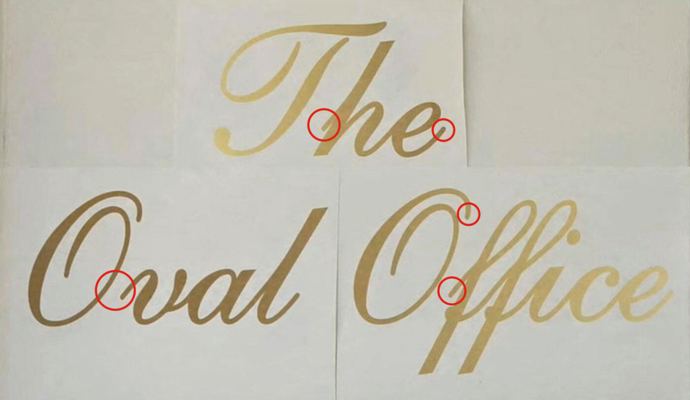 Besides the poor execution, there is another, bigger issue: script fonts are often inappropriate for a sign, and especially for cut-out letters. They’re narrow, decorative, and sensitive to bad spacing or low-quality rendering. They are also harder to read. And that all besides the fact that you really do not need a sign in front of the Oval Office.